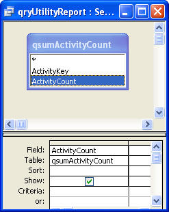 The first step is to bring any field from the embedded query, in this case qsumActivityCount, into the bottom half of the design window. The row labeled "table" contains the name of my embedded query. You can easily copy that query name onto your clipboard by highlighting it, and pressing the control and C keys simultaneously.