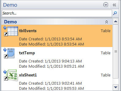 The image above shows three attached tables. The first table, tblEvents, is an Access database; the second, txtTemp, is a text file; and the third, xlsSheet1, is an Excel file.