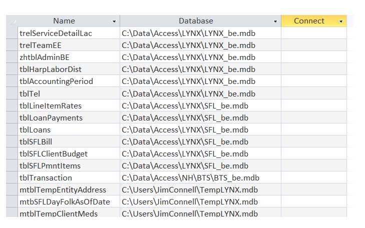 To use this, open a new query in design view, swap to SQL view (click view – choose SQL), and paste the SQL statement above into the window. Then run the query. You will get a listing of all the attached tables as well as the database they are coming from. The example below shows a set of tables with connections to multiple access databases.